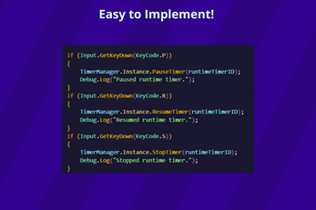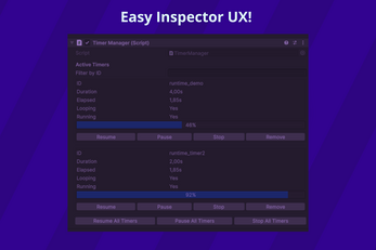 Built with flexibility and ease-of-use in mind for all types of developers, this asset allows you to define timers via code or through pre-made ScriptableObjects. The custom inspector makes it easy to visualize and manage timers during play mode for debugging.